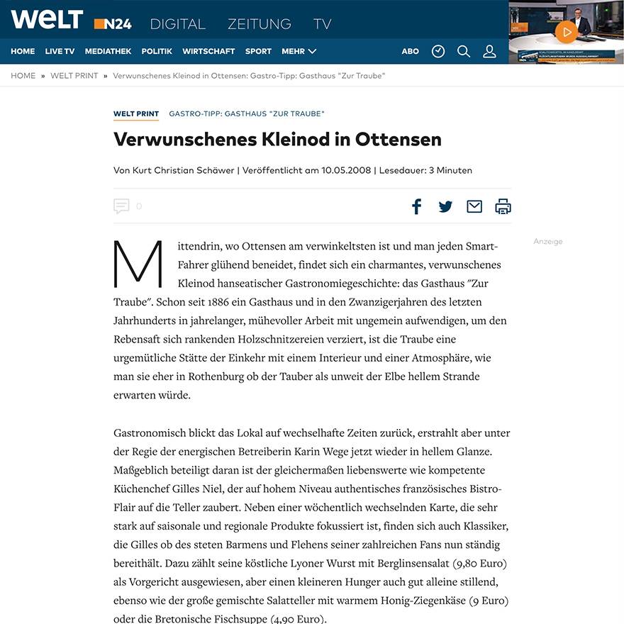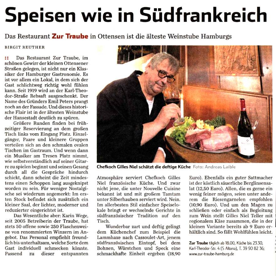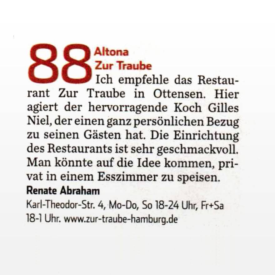 ... Zur Traube in Ottensen. Hier agiert der hervorragende Koch Gilles Niel, der einen ganz persönlichen Bezug zu seinen Gästen hat. Die Einrichtung des Restaurants ist sehr geschmackvoll. Man könnte auf die Idee kommen, privat in einem Esszimmer zu speisen...